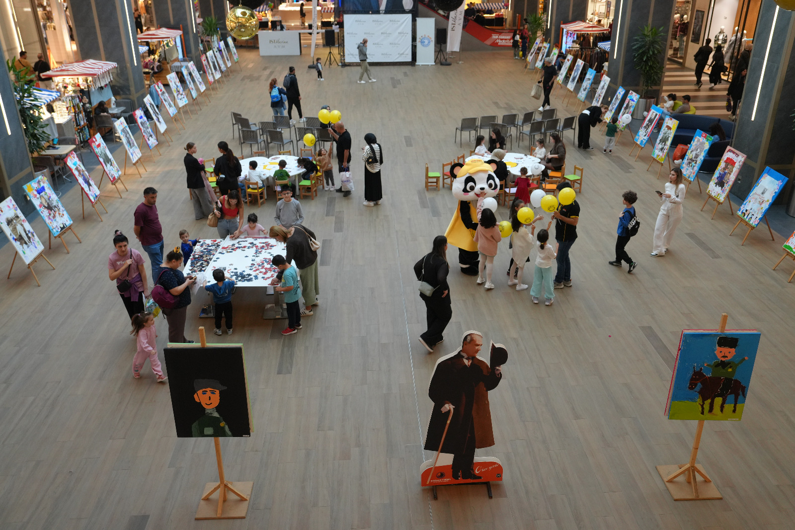 Görsel sanatlar öğretmenleri Gamze Metin ve Dilek Turan rehberliğinde hazırlanan sergide, 50 minik sanatçının eserleri yer aldı. Atatürk fotoğrafları üzerine yapılan kolaj çalışmaları ve özgün resimlerle oluşturulan sergide çocuklar, Cumhuriyet’in kurucusuna duydukları sevgiyi kendi renkleriyle ifade etti.